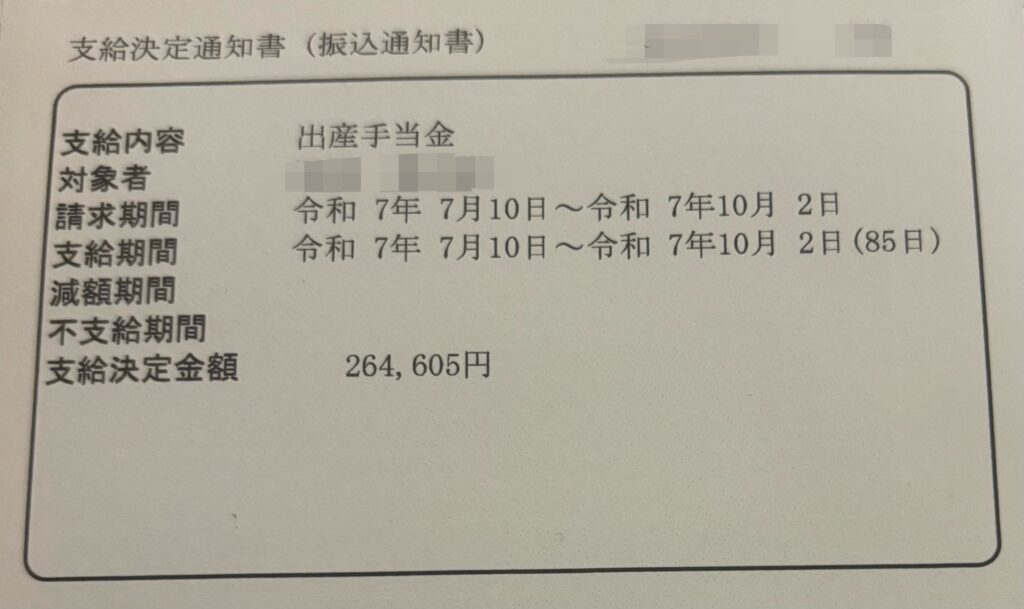 私はパート勤務で産前産後期間85日間で出産手当金が計264,605円でした!